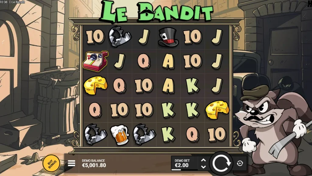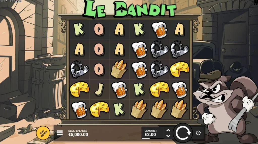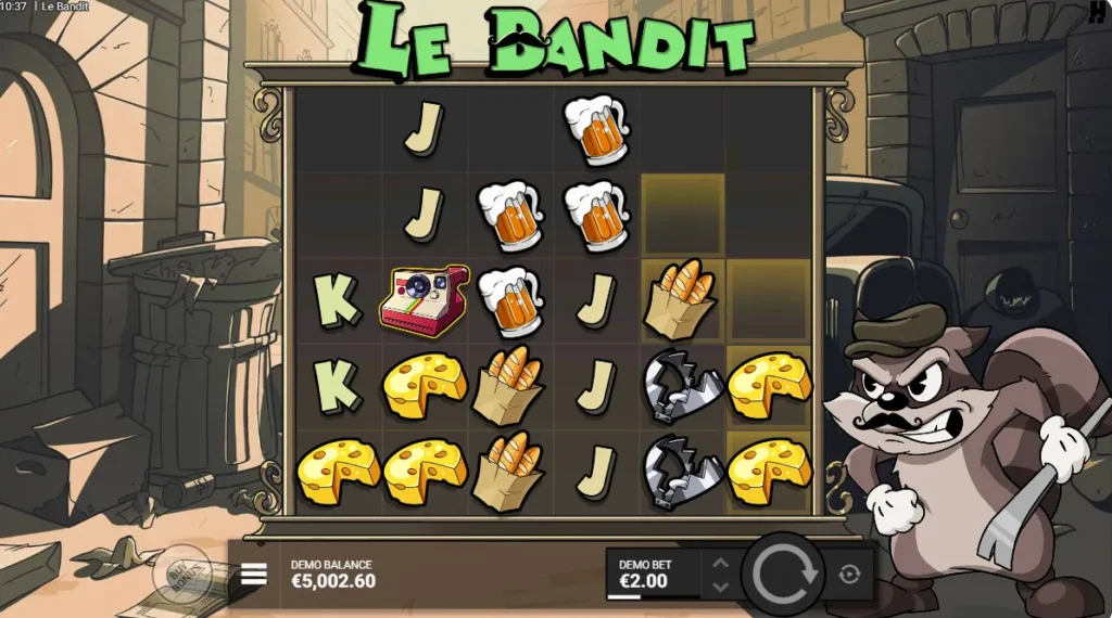 Le Bandit is a unique slot machine from the renowned provider Hacksaw Gaming, which transports players to the atmosphere of French streets, where the charismatic raccoon-bandit named Smokey is the main character. This slot combines a criminal theme with innovative game mechanics, creating an unforgettable experience for gambling enthusiasts.