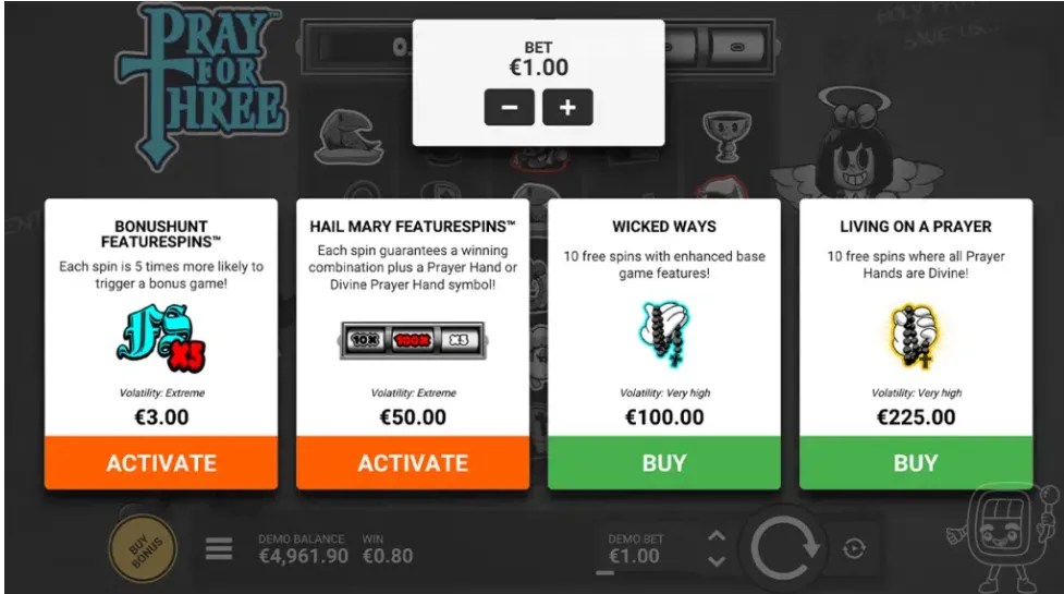 | Hail Mary FeatureSpins | x50 stake | Guaranteed win + Prayer Hand |